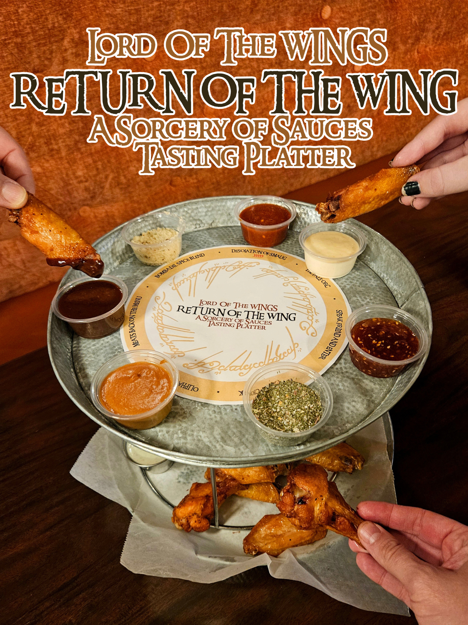 The $20 platter features 7 entirely NEW wing sauces, ranging from the spicy Desolation Of Smaug to the peanut butter Oliphant Blast, along with 10 naked wings. Rank your favorite to join our fellowship of sauces at Decades.